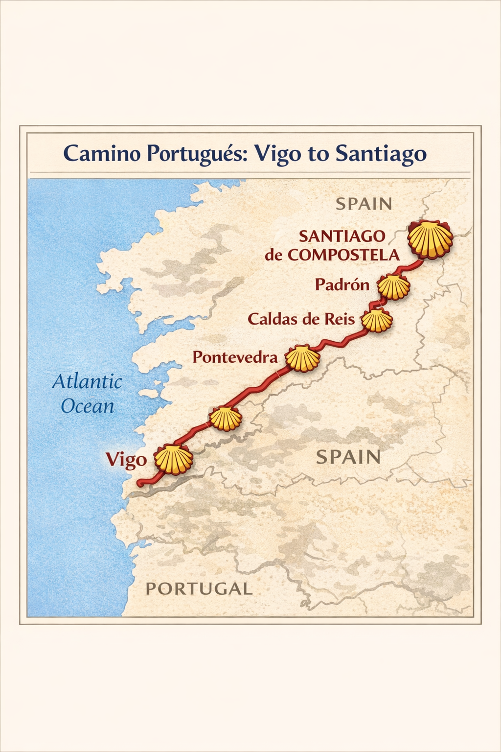 Vigo → Redondela → Pontevedra → Caldas de Reis → Padrón → Santiago de Compostela